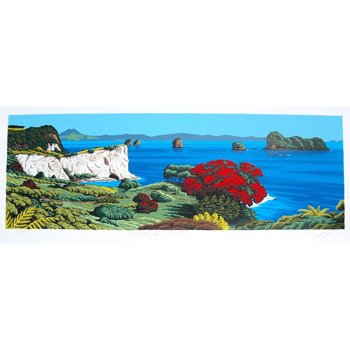 Tony Ogle was born in Auckland in 1959. After completing the AIT Graphic Design Diploma Course in 1979, he spent time in Northland working with artist Tom Burnett, producing silk screen prints that celebrated the coastal scenery of Northland. Also well known at this time was a series of screen prints inspired by the east coast of Great Barrier Island.