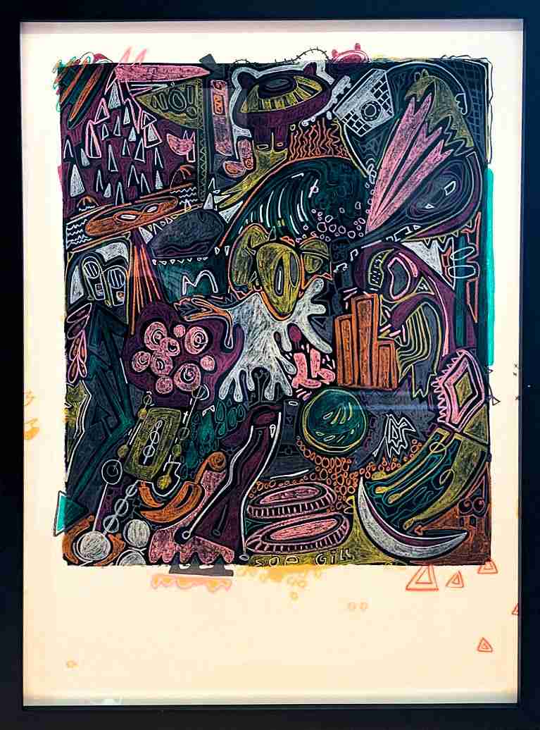Inspired by music and the people and places of her past, Sophie makes art that sings: bright, confident, energetic pieces, most often in acrylic and chalk pastel. Her influences are strongly musical, including jazz, rhythm and blues, as well as disco. These musical genresmeld and fuse into a spontaneous outpouring of shapes and motifs that explode on the canvas. Sophie’s dance background in jazz, ballet and hip hop disciplines informs her work and she brings this absolute joy in movement to the canvas.