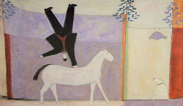 Annora Spencer (b.1963) is a highly collectable artist who has a distinctive style in her use of layered media. Many of her current works feature dogs along with stylised figures.
