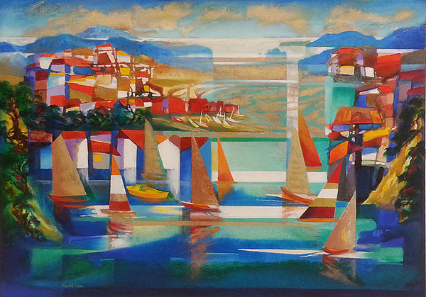 He believes artists should be using, in creative landscape, many lessons from past and present masters. Extensive visits to Europe exposed him to the use of gold in the work of icons, illuminated manuscripts, and Gustav Klimt, also to the work of European colourists. He has now combined these influences with his decades of water-colour expertise. Turner taught us the power of atmospheric imagination. In Harold Coops paintings can also be found the visual interplay of rectangular shapes and colours as taught us by Mondrian, the abstraction of buildings and landforms of Lyonel Feininger and the power of Bridget Rileys shimmering bands of colour.