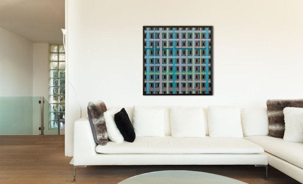 David Brown trained as an archaeologist and creates paintings where balanced geometric works clash with dynamic expressionistic figures. Work is Oil Based enamel on polycarbonate sheet.