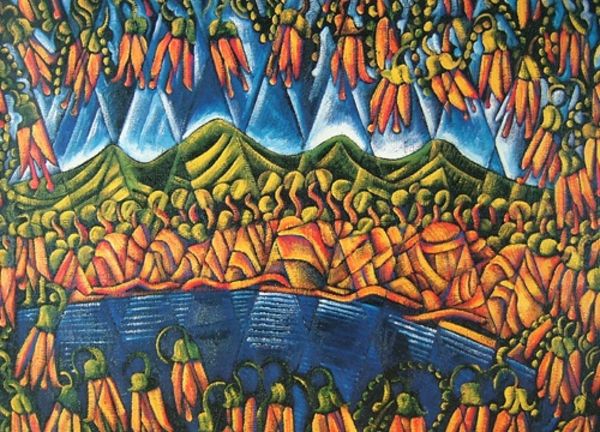 He expresses this love of landscape in his large oil paintings. Mountains, bush, coasts are rendered into semi-abstract forms outlined in thick strokes of color, often straight from the tube. They are colourful, dramatic and complex depictions of particular places. They have a raw vitality that reflects New Zealand's rugged scenery in cohesive, vivid, and strikingly energetic images.