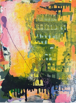 Of great importance is the physicality of the painted gesture. Mark making techniques and formal painterly concerns are important in her work. She is concerned with deliberate and less controlled paint application. One method is conscious mark making, whereby she is deliberate and in close proximity. The other is less controlled and more at a distance, by pouring and dribbling. This process of painting feels like being engaged and detached from it.