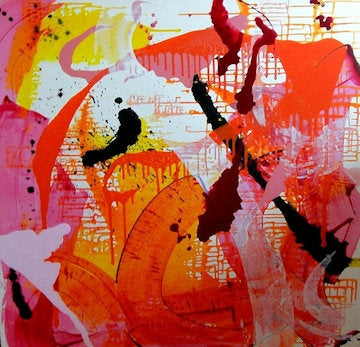 Of great importance is the physicality of the painted gesture. Mark making techniques and formal painterly concerns are important in her work. She is concerned with deliberate and less controlled paint application. One method is conscious mark making, whereby she is deliberate and in close proximity. The other is less controlled and more at a distance, by pouring and dribbling. This process of painting feels like being engaged and detached from it.