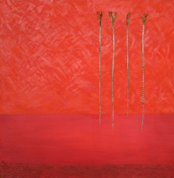 Oil and Stitched Cabbage Tree on Canvas - Height 91cm x Width 91cm