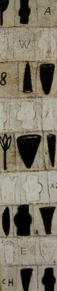 Cam’s unique pictorial language is comprised of juxtaposed shapes, symbols and markings. Simultaneously strange yet familiar, recurring motifs in her work derive from legend, history and belief systems. The artist’s restricted tonal palette serves to accentuate the significance of these cryptic markings: why are they there, and what – if anything - do they mean?