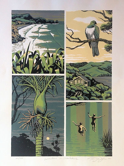 Tony Ogle was born in Auckland in 1959. After completing the AIT Graphic Design Diploma Course in 1979, he spent time in Northland working with artist Tom Burnett, producing silk screen prints that celebrated the coastal scenery of Northland. Also well known at this time was a series of screen prints inspired by the east coast of Great Barrier Island.